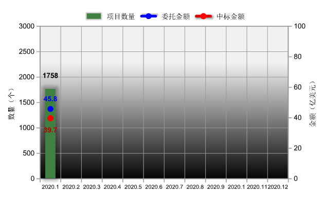 據統計,2020年1月全國機電產品國際招標中標金額達39.7億美元,同比增長1.9%;委托金額45.8億美元,同比增長3.2%;中標項目數量1758個,同比下降24.9%。