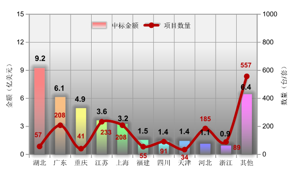 按各地區機電產品國際招標情況統計:2020年1月份全國各省市機電產品國際招標情況(按中標金額排序前十位地區),湖北省占據單月中標金額榜首,中標金額9.2億美元,同比增長64.5%;項目數量57個。廣東省位居第二,中標金額6.1億美元,同比上漲222.8%;項目數量208個。重慶市排名第三,中標金額4.9億美元,同比增長1979.1%;項目數量41個。江蘇、上海、福建、四川、天津、河北、浙江等省市地區分居第四至第十位。