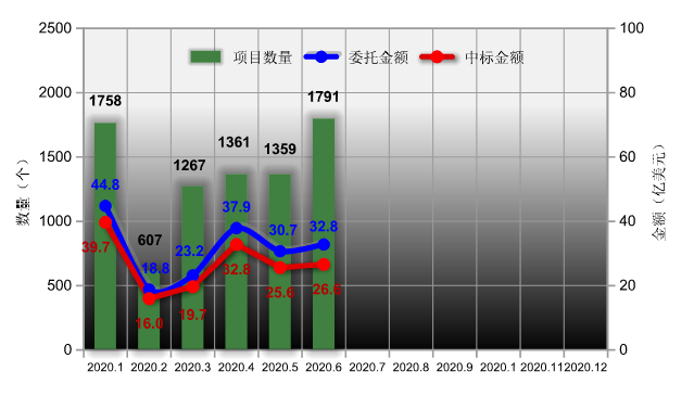 其中,6月份單月全國機電產品國際招標中標金額26.6億美元,同比下降30.7%,環比增長3.8%;委托金額32.8億美元,同比下降25%,環比增長31.8%;中標項目數量1791個,同比增長1%,環比增長7.1%。