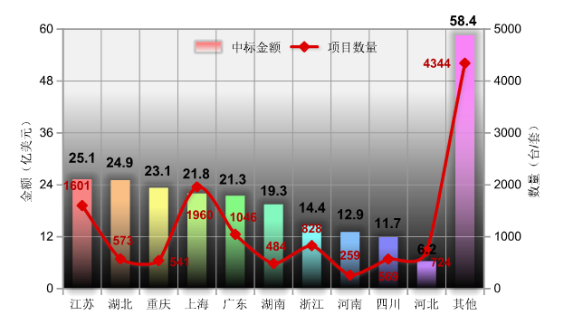 按各地區機電產品國際招標情況統計:截止到9月份,江蘇省累計中標金額25.1億美元位居全國之首,同比下降6.4%;項目數量1601個。湖北省緊跟其后,累計中標金額24.9億美元,同比下降7.2%;項目數量573個。重慶市排名第三,累計中標金額23.1億美元,同比增長607.9%;項目數量541個。上海、廣東、湖南、浙江、河南、四川、河北等省市地區分居第四至第十位。