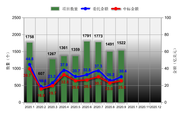 9月份當月,全國機電產品國際招標中標金額25.6億美元,同比下降38.7%,環比增長11.4%;委托金額30.4億美元,同比下降39.3%,環比增長2.1%;中標項目數量1522個,同比下降31.6%,環比增長16%。