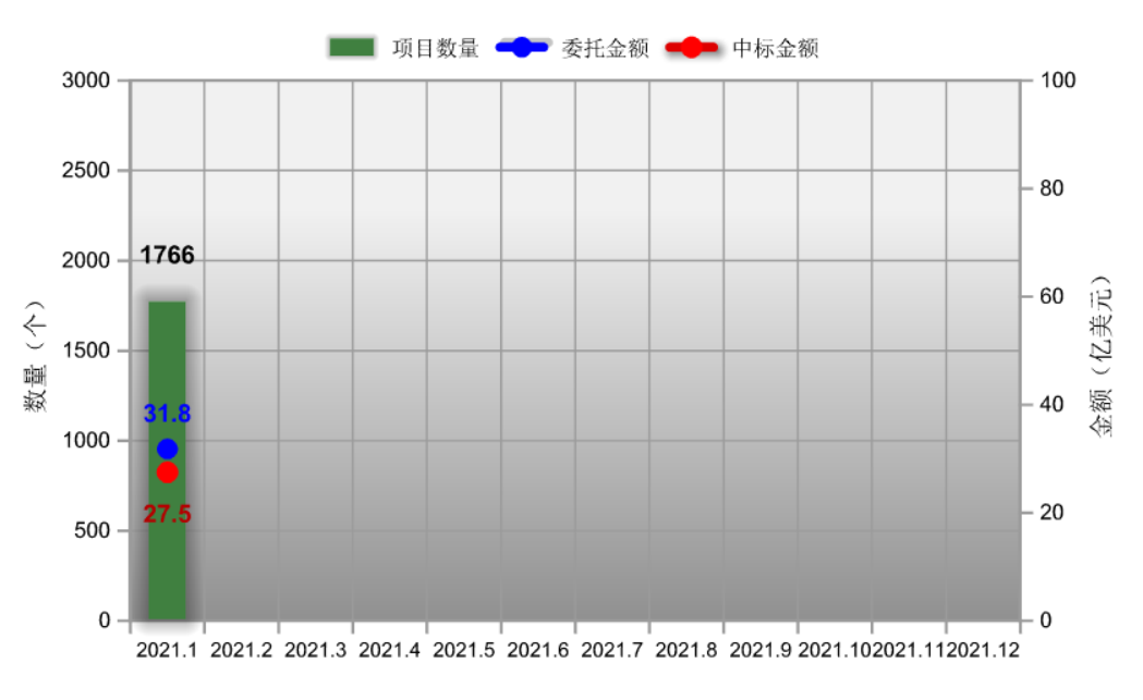 據統計,2021年1月全國機電產品國際招標中標金額達27.5億美元,同比下降30.8%;委托金額31.8億美元,同比增長3.2%;中標項目數量1766個,同比下降24.9%。